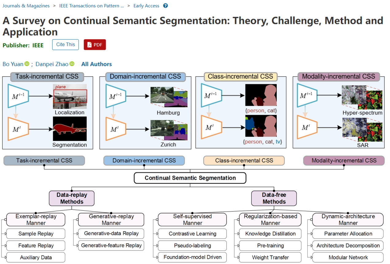 在上述研究基础上,赵丹培老师团队发表领域内首篇持续语义分割综述。该论文面向分割任务的终身学习综述,首次涵盖四种任务模式,两类技术途径,五种算法设计,十四类模型架构,建立一个开源的项目主页,支持持续学习算法的构建与应用。该综述全面调研了持续语义分割领域的挑战、方法、数据集、定性定量评价、交叉学科应用以及未来发展趋势等,可为相关领域的研究人员提供重要参考和启发,为终身学习领域的发展提供研究路线和技术基础。(论文链接:https://ieeexplore.ieee.org/abstract/document/10643308)
