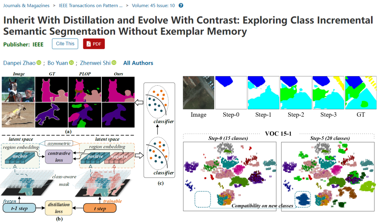 这三篇论文由我院赵丹培副教授和2022级博士研究生苑博等完成。论文均围绕基于持续学习的图像解译任务展开研究,为终身学习理论在图像分割、感知和认知领域的应用奠定了基础,也为更高层次的人工智能在遥感图像持续解译领域提供了重要的理论依据和引用价值。上述研究工作得到了国家自然科学基金(No.62271018)的资助。