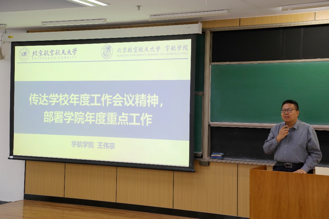 院长王伟宗传达了学校2026年度工作会精神,对学校、学院2025年取得的成绩及2026年工作要点进行了宣贯解读。他强调,新的一年里,学院要以有组织的科研为牵引,主动对接国家重大工程,实现学院发展与国家战略需求同频共振。在此过程中,青年教师要传承自力更生的航天精神,敢于在新兴领域开拓创新;更要主动走出校园,深入航天工业部门在真问题中对接真需求,在建设航天强国的征途中贡献学院的智慧和力量。